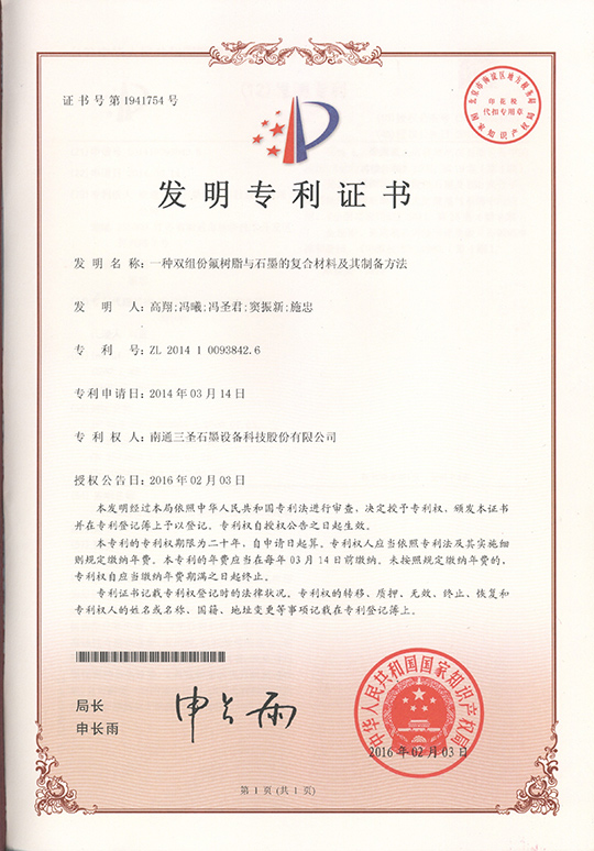 2016年2月18日,南通三圣石墨設(shè)備科技股份有限公司收到國(guó)家知識(shí)產(chǎn)權(quán)局的發(fā)明專利證書,該公司的發(fā)明專利"一種雙組份氟樹脂與石墨的復(fù)合材料及其制備方法"獲得了國(guó)家授權(quán)。該項(xiàng)專利涉及一種完全意義上的新型氟-石墨復(fù)合材料,該復(fù)合材料既具有石墨優(yōu)良的導(dǎo)熱性能,又具有優(yōu)異的耐腐蝕性能,由該種材料制成的換熱設(shè)備可用于強(qiáng)腐蝕工況條件下的換熱,打破了此前常規(guī)設(shè)備滲透壓力耐受瓶頸,實(shí)現(xiàn)了鋼鐵酸洗工序上酸液換熱設(shè)備的國(guó)產(chǎn)化。