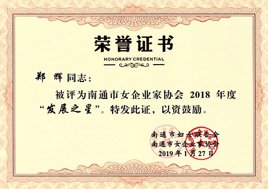 南通三圣集團副董事長鄭輝女士被南通市婦女聯(lián)合會、南通市女企業(yè)家協(xié)會評為2018年度“發(fā)展之星”,全南通市僅有8位女企業(yè)家獲此殊榮。